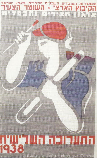 שמואל. הכרזה מתארת חבר קיבוץ המניף כלפי מעלה מכחול בידו בתנועה מציירת ועל כתפו נושא טוריה. "במכחול