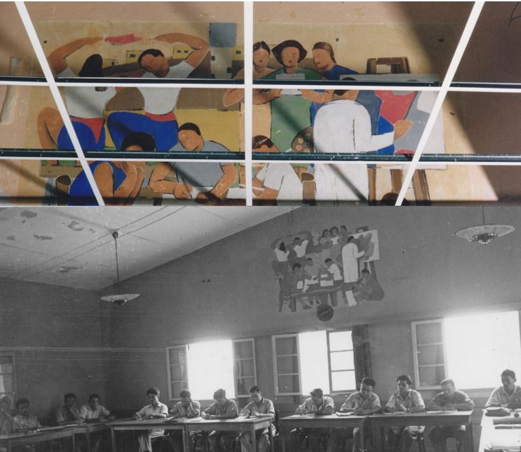 | ציור קיר בבית הספר המקצועי בשריד של הנער – אלכס לוי בן - ה15 משער העמקים - שנות החמישים המוקדמות בהשפעת הסגנון המקסיקני |