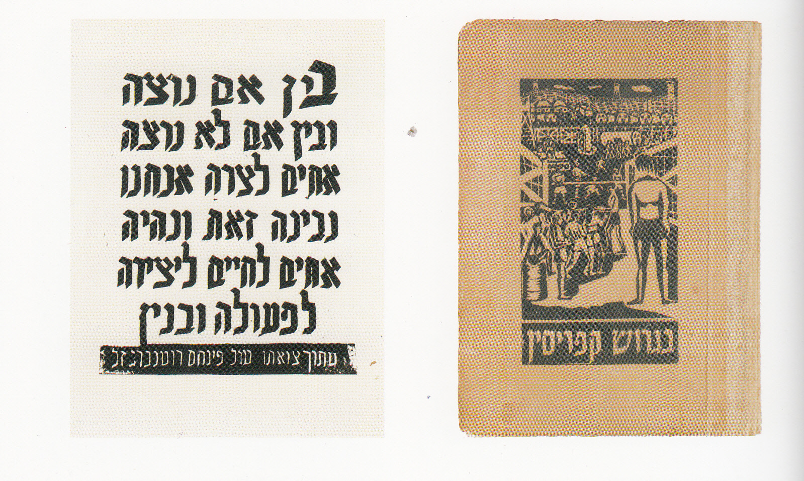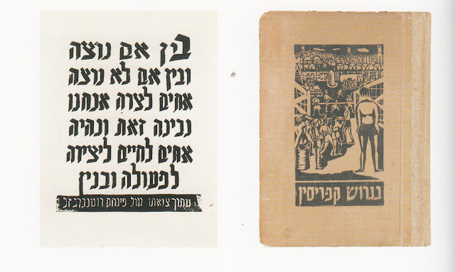 לינולאום המבטאים את שגרת חיי היום, יום במחנות. את הסדנה הנחה האמן נפתלי בזם